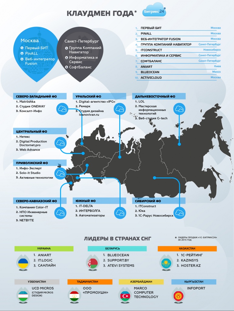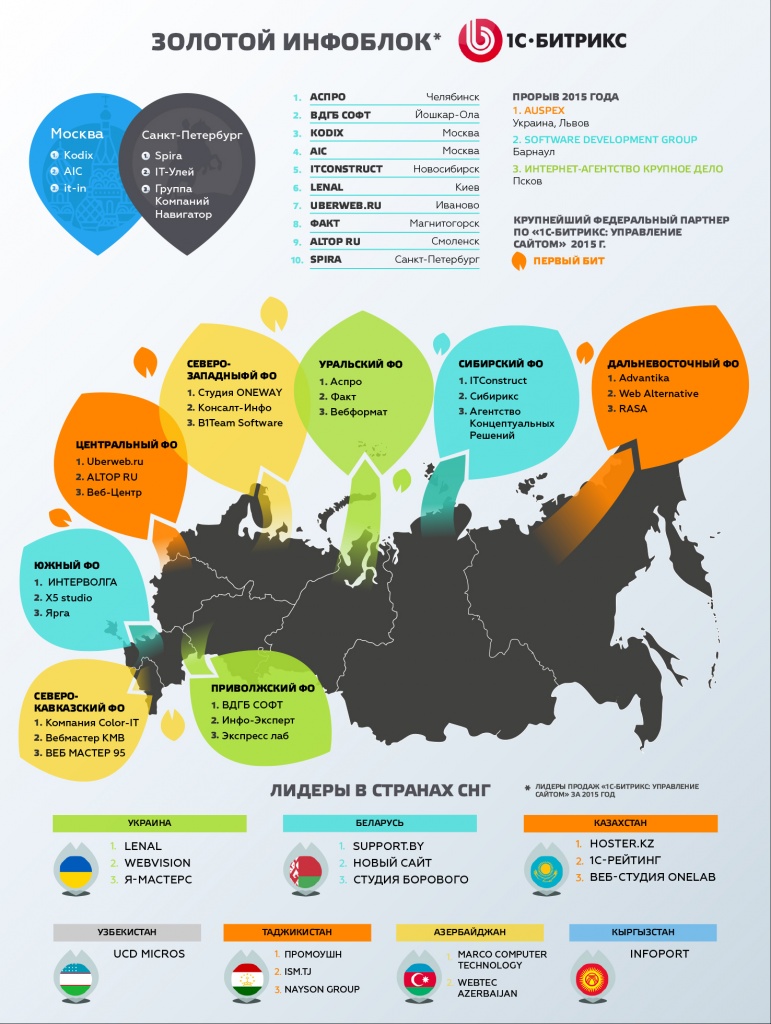 Полный список партнеров из России и стран СНГ, отмеченных статуэтками и почетными призами рейтингов «Лидер продаж» 2015 года, доступен на партнерском сайте «1С-Битрикс».